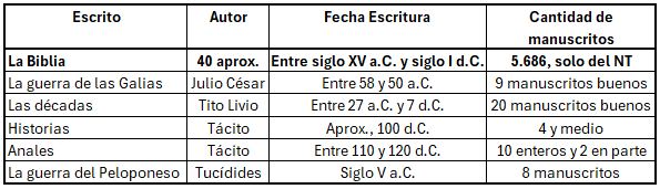 En cuanto a la evidencia documental, ningún otro texto de la Antigüedad se acerca a la Biblia. Obras clásicas como La guerra de las Galias de Julio César o los escritos de Tácito cuentan con escasos manuscritos y grandes distancias temporales respecto a sus originales. En contraste, la Biblia posee miles de manuscritos, tanto del Antiguo como del Nuevo Testamento, lo que permite reconstruir con gran precisión el texto original.